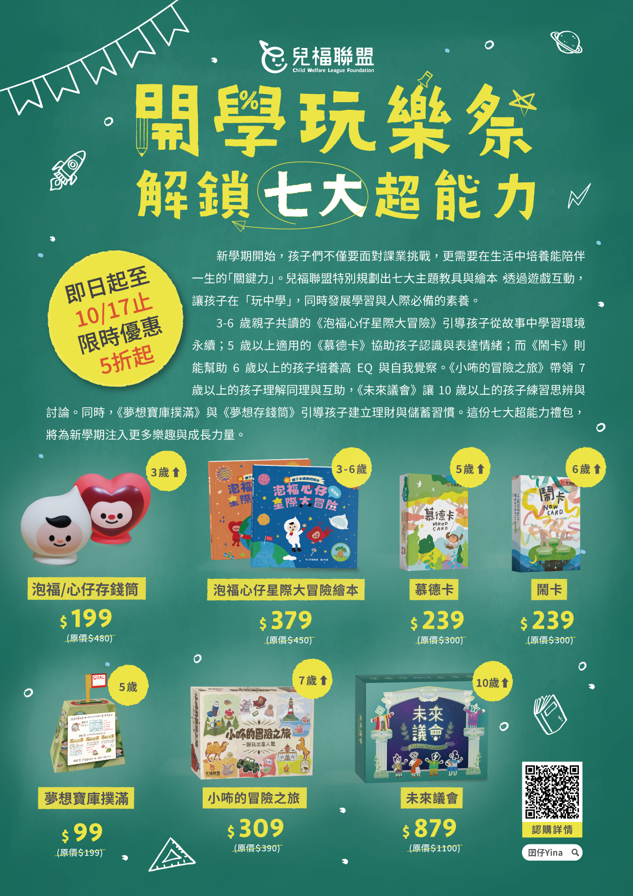 本會長期關注兒少身心發展,為協助孩子在新學期能兼顧知識學習與生活素養,特規劃「開學玩樂祭·解鎖七大超能力」成長禮包,透過繪本、桌遊及互動工具,引導孩子在遊戲中培養未來關鍵能力。 |